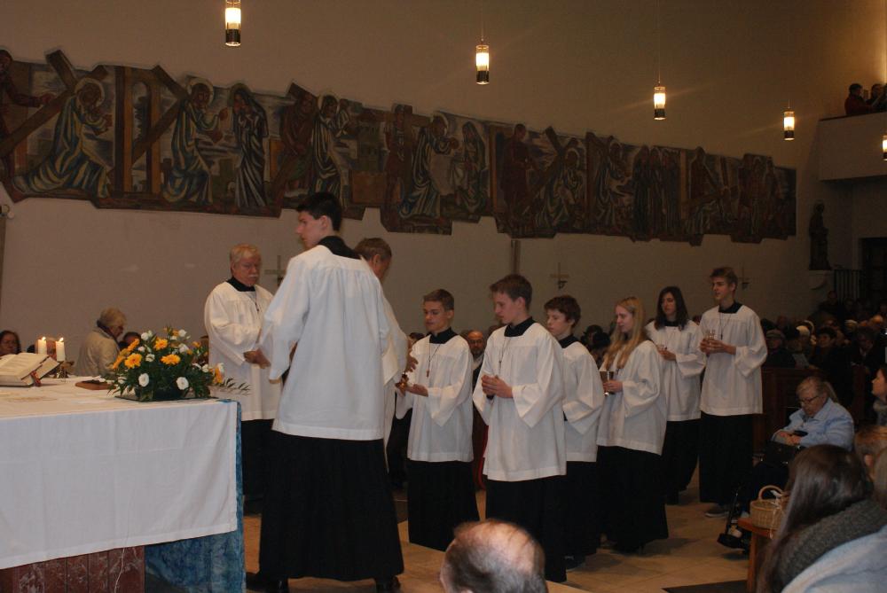 Am Christkönigsonntag, dem 22.11.2015 wurde unser neuer Pfarrmoderator GR Mag. Helmut Ringhofer durch Bischofsvikar P. Mag. Dariusz Schutzki CR in sein Amt eingeführt. Zu Beginn der Messe haben der stellvertrende PGR-Vorsitzende Erich Richtarz im Namen der Pfarrgemeinde und die Bezirksvorsteherin im Namen der Bezirkshauptmannschaft die Begrüßungsworte gesprochen. Darauf erfolgte die Schlüsselübergabe: Altpfarrer Henk Landman hat dem Bischofsvikar einen symbolischen Pfarrschlüssel überreicht als Zeichen der Übergabe der Leitung und Verantwortung für die Pfarre. Der Bischofsvikar hat wiederum dem neuen Pfarrmoderator diesen Schlüssel überreicht. Nach dem Taufgedächtnis und der Bereitschaftserklärung zur Amtsübernahme hat Dechant Nawotka das Ernennungsdekret verlesen. Vor dem Evangelium wurde die Heilige Schrift an den neuen Pfarrmoderator überreicht. Nach dem Glaubensbekenntnis hat der Bischofsvikar dem neuen Pfarrmoderator Helmut Ringhofer das Ernennungsdekret und auch dem Leitungsteam das Verlängerungsdekret überreicht. Die Hauptamtlichen und die PfarrgemeinderätInnen haben Helmut Ringhofer ihre Bereitschaft zur Zusammenarbeit per Handschlag bekundet. Am Ende der Messe haben der Pastoralassitent und zwei Vertreter der Ministranten: der dienstälteste Oberministrant und die dienstjüngste Ministrantin Altpfarrer Henk Landman einen "Oscar für sein Lebenswerk Namen Jesu" verliehen. Die Kinder haben dem neuen Pfarrmoderator eine Willkommenskerze und eine Mappe mit Zeichnungen geschenkt. Es war eine stimmungsvolle und lebendige Messe in der vollbesetzten Kirche. Der Bischofsvikar hat mit seiner lockeren Art vor allem bei der Predigt die Pfarrgemeinde begeistert. Die Musik und der Gesang haben zur feierlichen und freudigen Stimmung viel beigetragen: Unsere Kirchenmusiker Stefan Wurm und Christian Flörré haben neben dem Gemeindegesang die Tamblingsmesse erfolgreich geleitet im Zusammenwirken mit der Mezzosopranistin Daniela Treffner und dem Trompeter Valentin Sinko. Auch der Empfang im Saal nach der Messe war gekennzeichnet durch eine heitere, lockere und fröhliche Atmosphäre. Wir wünschen dem neuen Pfarrmoderator Helmut Ringhofer alles Gute, viel Freude, Kraft und Gottes Segen in seinen neuen Aufgaben. Webredaktion.